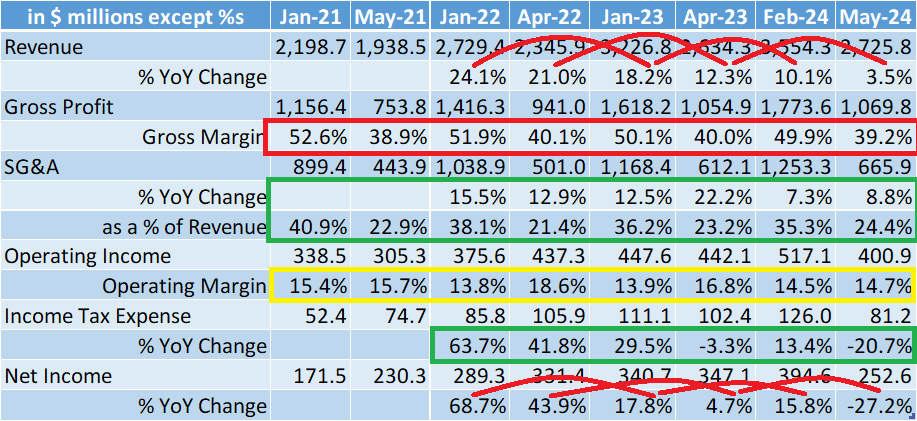 So, ULTA was flagged for deteriorating operations. Let’s analyze the income statement from various angles. Firstly, let’s analyze YoY numbers.