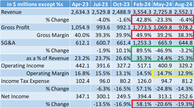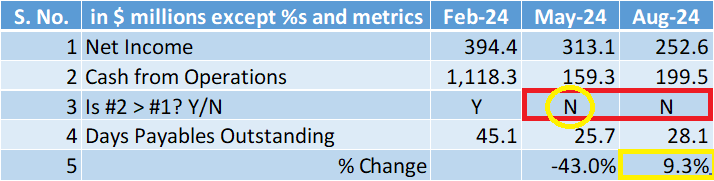 CFFO < NI in the quarter that ended in May should have been the first warning that operations were deteriorating. Even if CFFO goes below NI, it needs to be evaluated further and should not be the “end all and be all” of it.