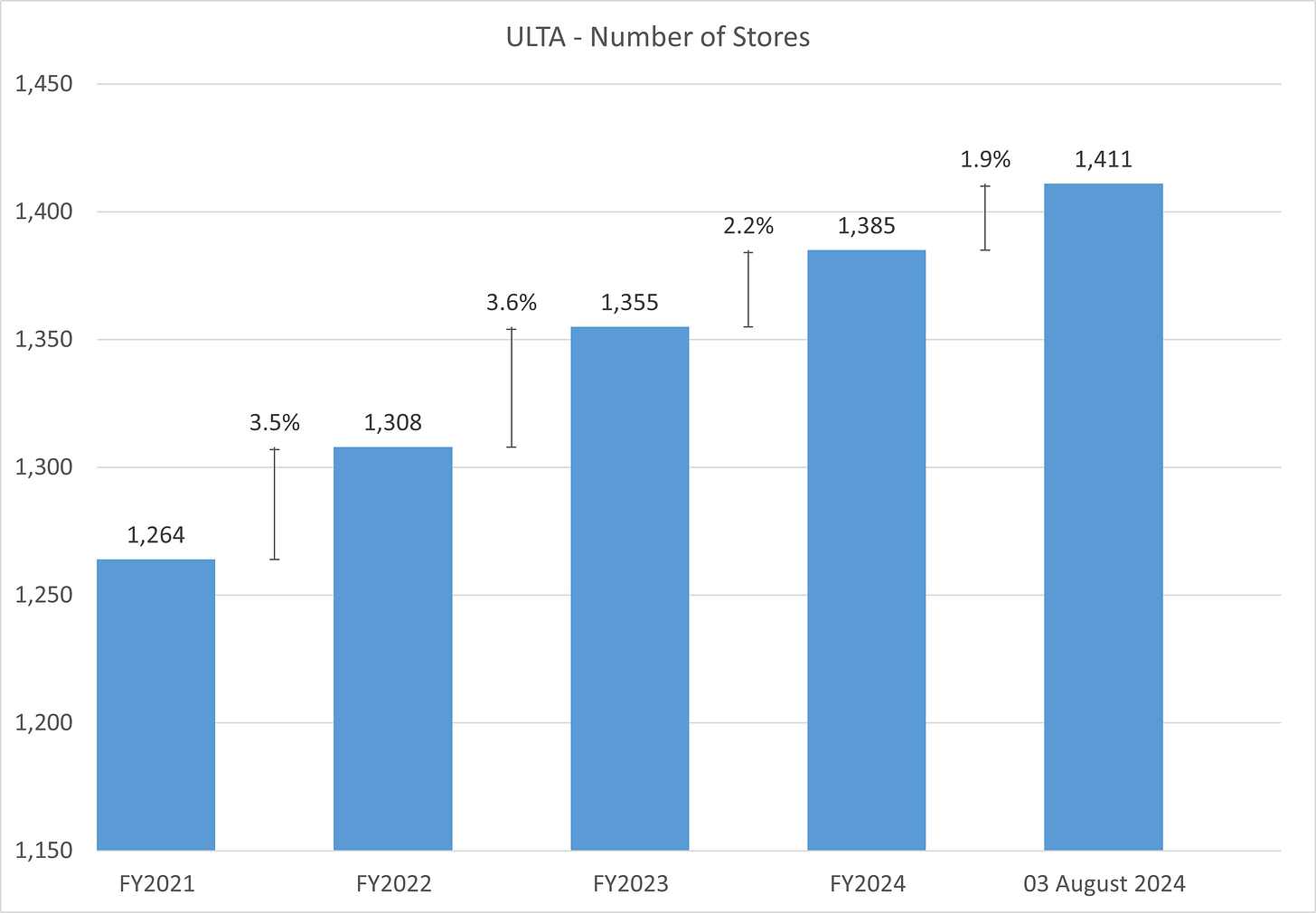 ULTA is already in 50 states. Currently, it has 1411 stores, and in the long term, it hopes to support 1,500 to 1,700 stores in the US. However, what is the pace of new store openings?
